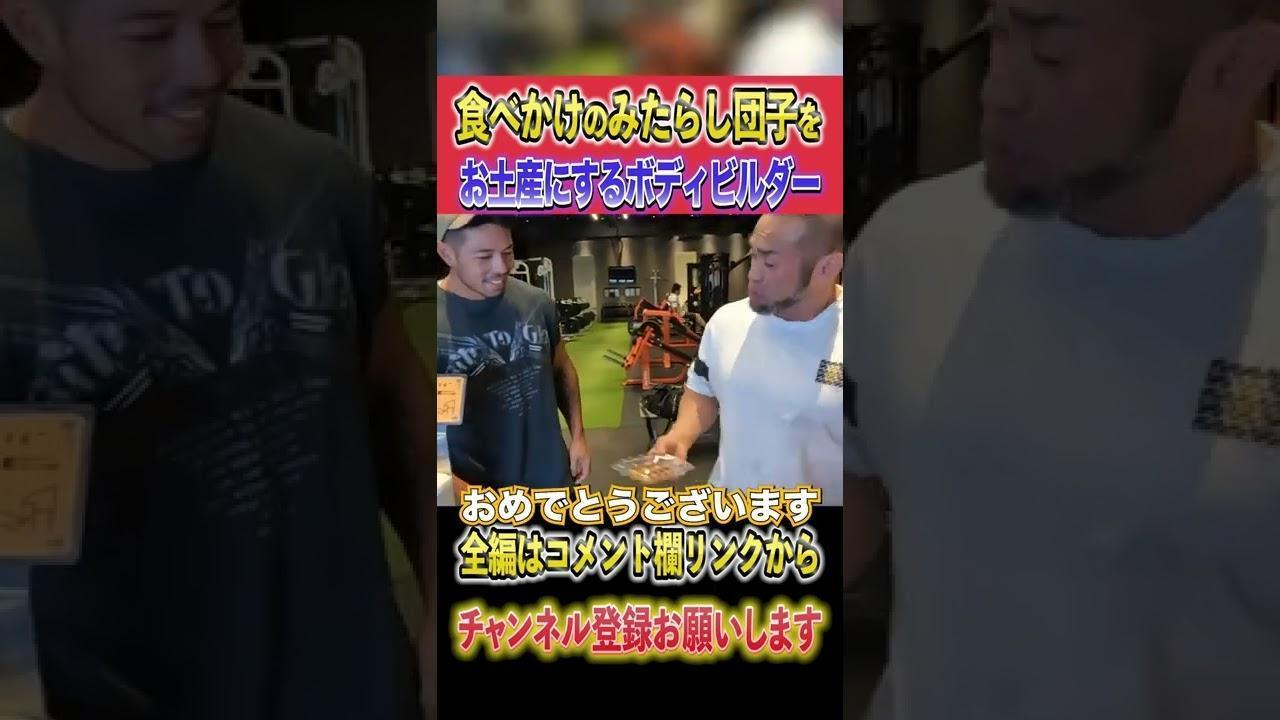 食べかけの串団子をお土産に渡すボディビルダー